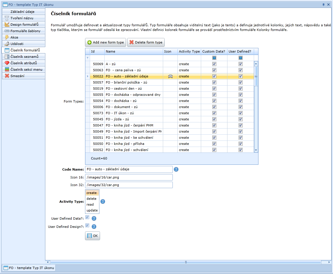Formulář - Číselník formulářů vypadá takto: