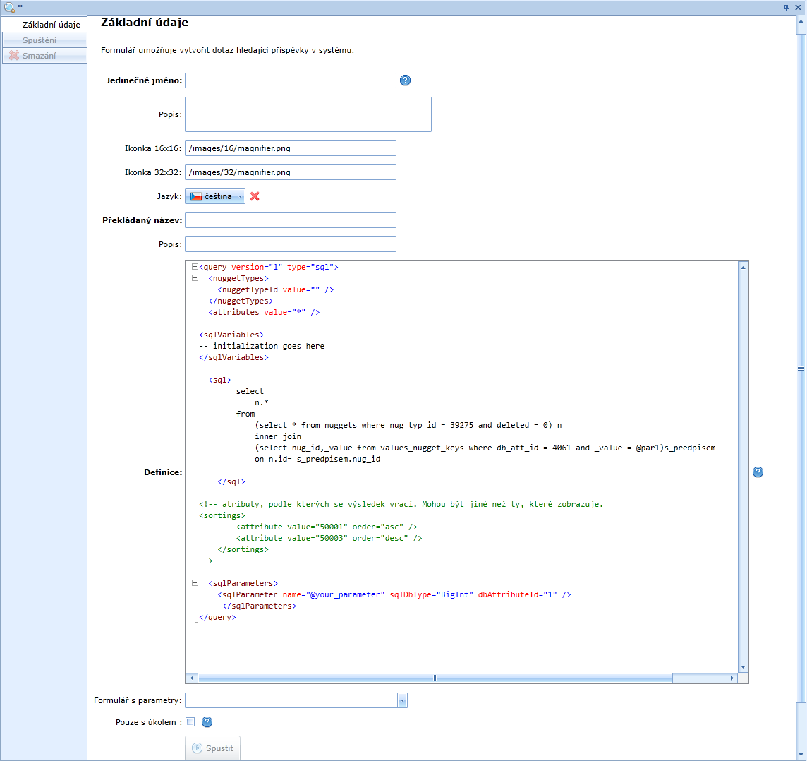 • sqlParameters – Parametry. Používá se pouze v případě, že je dotaz použit v kontextu typu formuláře. Parametr získává svoji hodnotu z kolonky formuláře respektive z atributu, který kolonka používá.