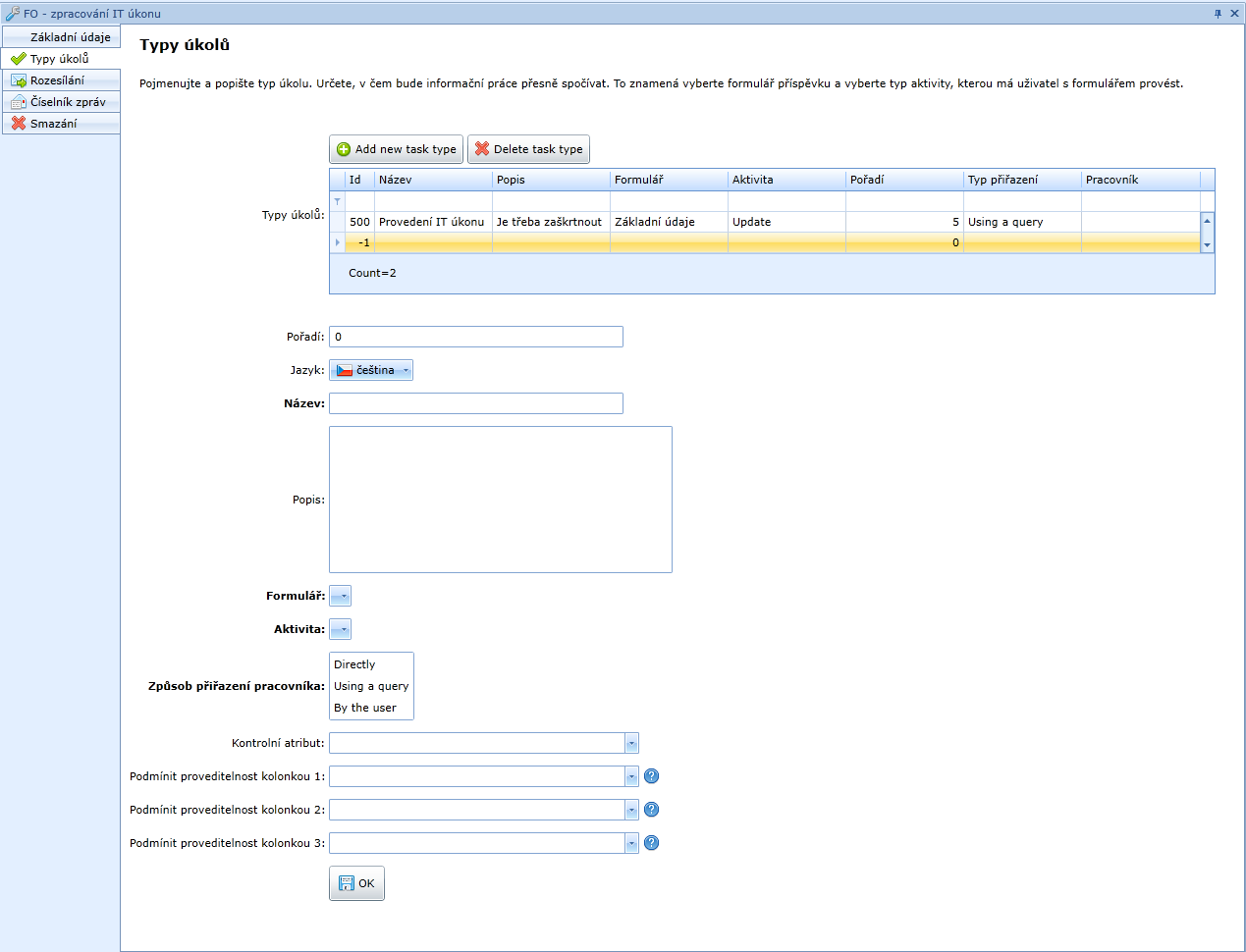 • Typy úkolů – kolonka umožňuje aktualizovat úkoly.