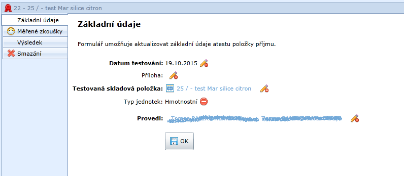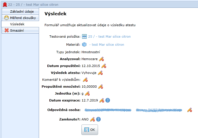 Atest se po zapsání výsledku zamkne. Tím ztrácí role Laborant práva atest měnit.