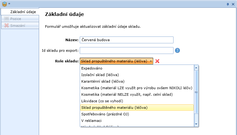 • Implicitní sklad, který je předvybrán u položky daného materiálu v seznamu dostupných skladů.
