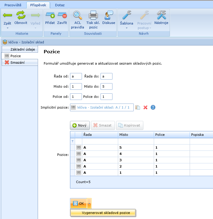 Tato místa je možné vygenerovat najednou pro celý sklad, je-li pravidelně uspořádán, či postupně například přes jednotlivé řady.