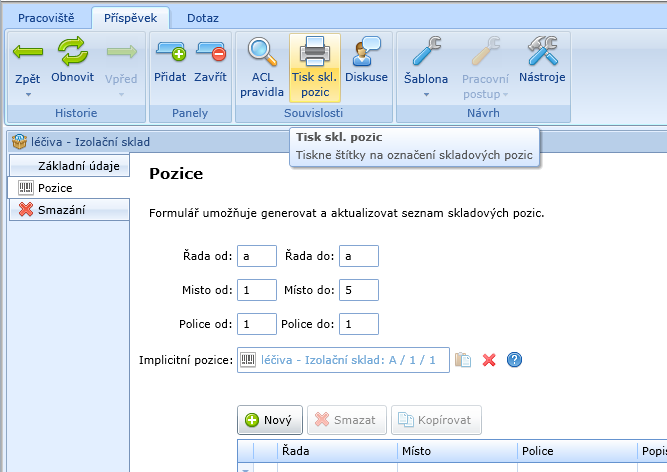 Tisková sestava se štítky pro definovaná paletová místa se spouští z menu Příspěvek, je-li daný sklad otevřen.