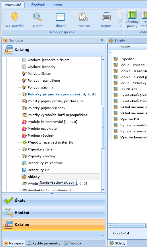 Existující sklady lze nalézt pomocí složky Sklady v Katalogu týmu Kosmetika: